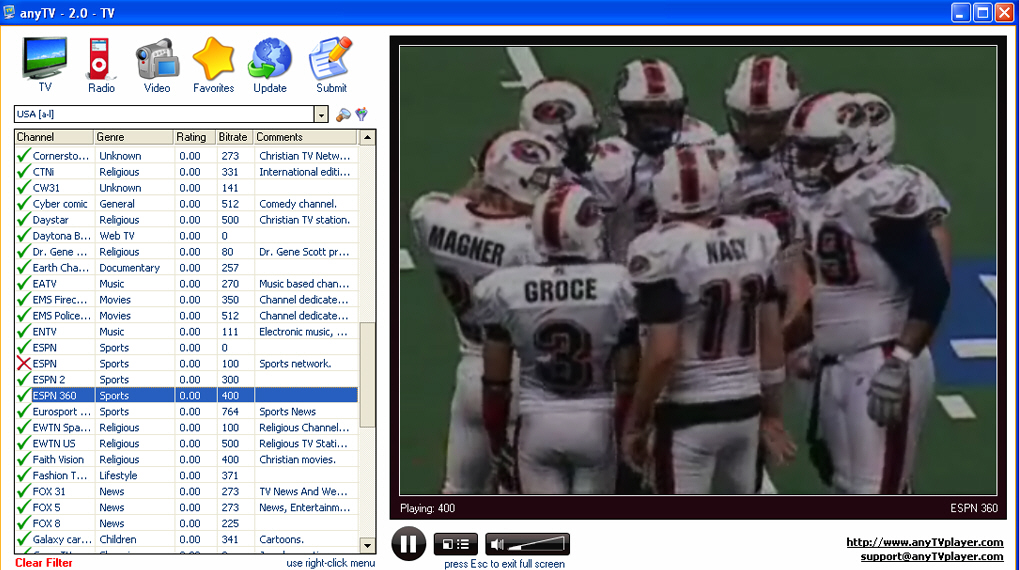 AnyTV는 전세계 8000여개 이상의 TV, 라디오 방송을 시청/청취 할 수 있는 프로그램입니다. 프로그램을 실행한후 채널리스트에서 원하는 방송을 클릭하면 방송이 나옵니다. 전체화면으로 보기도 지원하며 채널 업데이트도 지원합니다. 지금 소개해드리는 버전은 무료 버전으로 채널 리스트 업데이트에 제한이 있습니다.